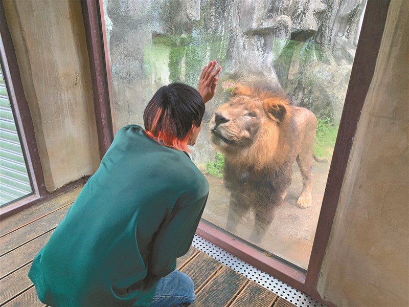 壽山動物園保育員林晏民負責照護獅王「小辛」,三年的相處已有互信,小辛也會不時撒嬌。圖/記者王淑芬