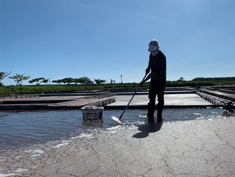 嘉義縣布袋鎮洲南鹽場的晒鹽人,開心晒鹽,拜陽光之賜,產量增加。圖/取自洲南鹽場臉書