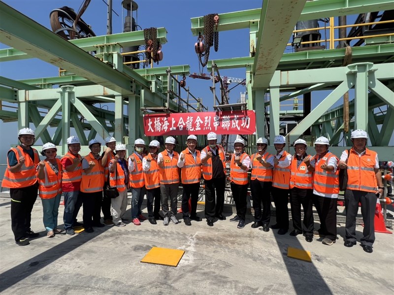 交通部長王國材、金門縣長楊鎮浯、立委陳雪生、立委洪孟楷等人見證金門大橋合攏,並與工程人員合影。圖╱蔡家蓁