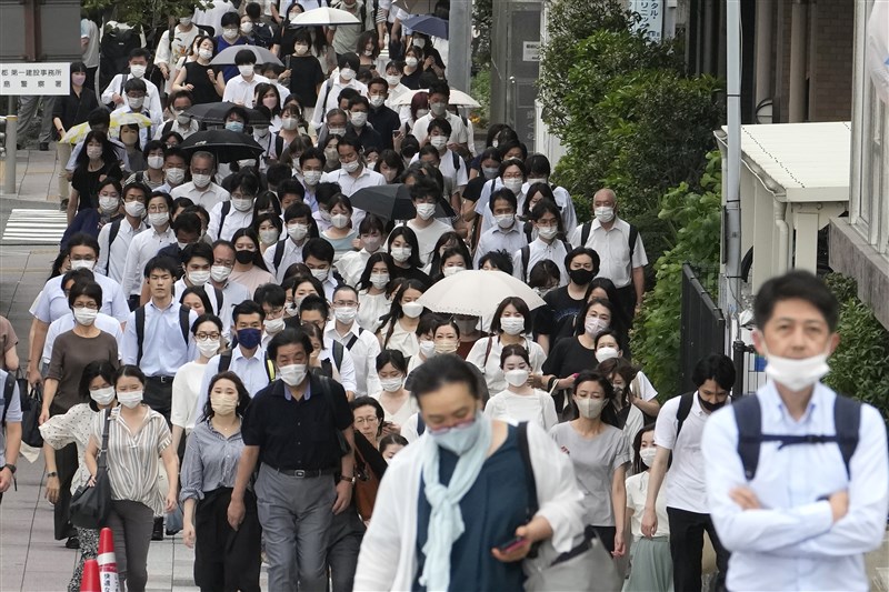 受到新冠變種病毒「BA.5」變異株影響,日本第7波疫情升溫,22日新增確診數衝破19萬大關。圖為上班通勤情形。圖/美聯社