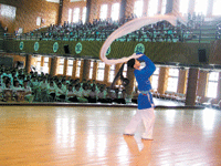 昨天演出的折子有「耍水袖」、「小腳踩高蹺」、「拾玉鐲」、「手帕功」等,其中水袖長達二百七十公分,是國內罕見的,活動中也邀請師生上台互動,帶動節目高潮。