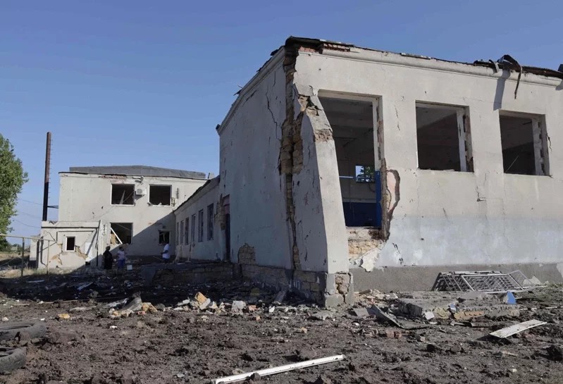 圖為敖德薩地區一村莊,遭俄軍空襲後的慘狀;其中一座建築物,嚴重損毀。圖/法新社