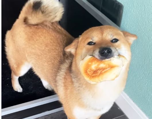 影片中只見柴犬嘴裡叼著一塊麵包從其他地方走了過來,接著抬起頭望向飼主,似乎想表達拿到零食很開心的牠,停下腳步搖著尾巴耳朵向後,一臉笑咪咪的表情看起來非常幸福。