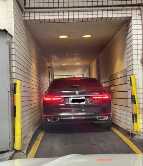 BMW大7去買麥當勞,「神技貼壁」過超窄得來速,網友說,車主心臟也太強。圖/翻攝爆廢公社