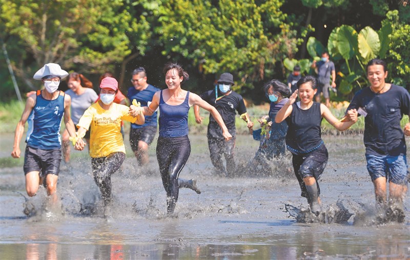 「類熱浪」持續發威,昨天至下午2時,最高溫為花蓮富源40.4°C,追平前天紀錄;板橋站39.4°C則創下該站新高。圖為民眾參加彰化溪州黑泥季,到田裡玩泥巴消暑。圖/黃仲裕