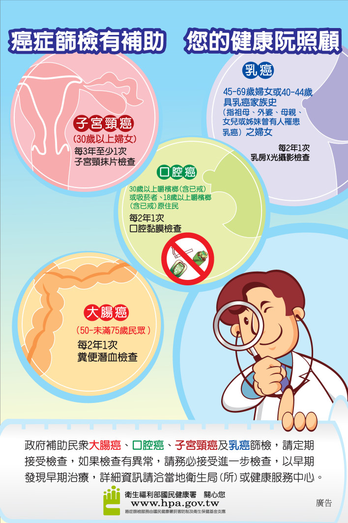 乳癌:45-69歲婦女、40-44歲二等血親內曾罹患乳癌之婦女,每2年1次乳房攝影檢查。