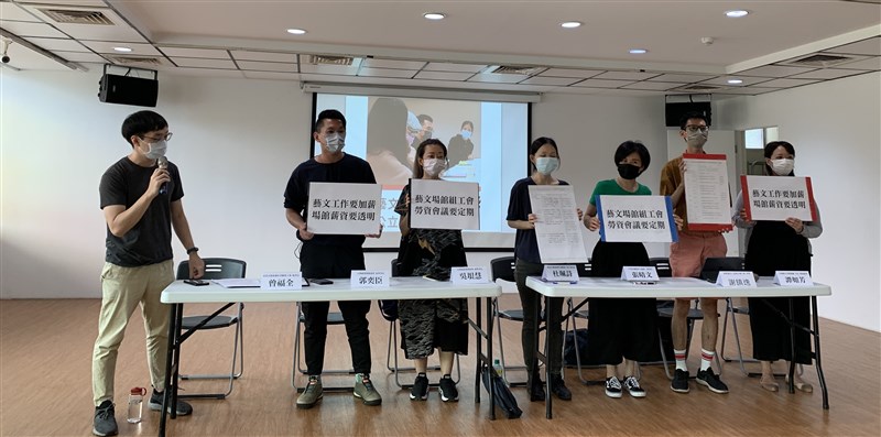 台北市藝術創作者職業工會,攜手多個藝文團體共同召開記者會,向政府大聲疾呼三大訴求,包括「藝文工作要加薪」、「場館薪資要透明」、「藝文場館組工會」。圖/記者曹麗蕙