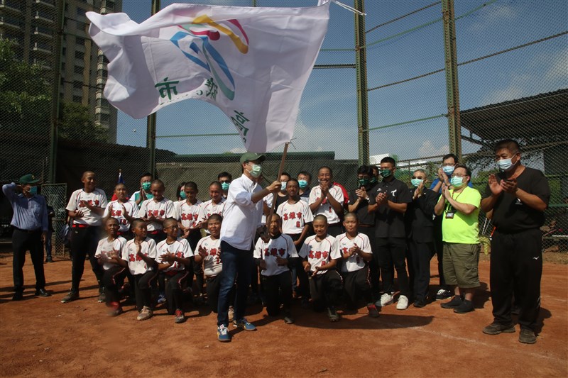 高雄市中正國小少棒隊取得代表權將赴美國參加「2022美國小馬聯盟野馬級世界少棒錦標賽」,高雄市長陳其邁為代表團授旗。 圖 / 記者王淑芬
