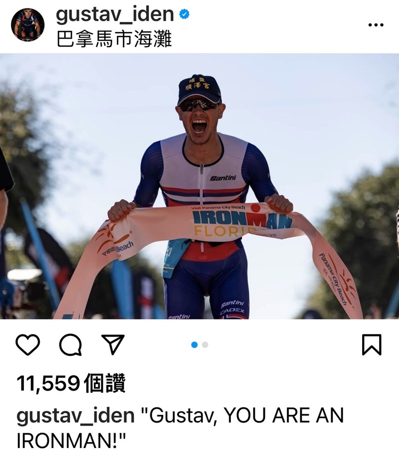 挪威三鐵冠軍好手伊登和順澤宮帽在各大賽場形影不離,在參加「佛羅里達州鐵人三項賽」時也戴著「埔鹽順澤宮」冠軍神帽奪冠。圖/instagram/gustav_iden