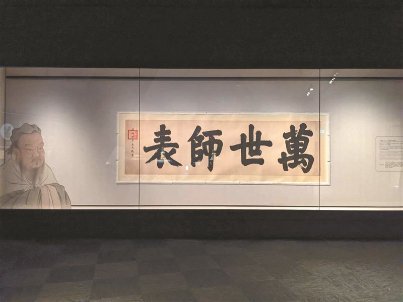 故宮南院指出,〈清.聖祖御筆書萬世師表〉展幅寬四百零五公分、高一百二十公分,這件珍貴的康熙墨寶,是由孔子第七十七代嫡長孫孔德成,於一九八八年捐贈給故宮博物院,文化部於二○一九年指定為國寶。