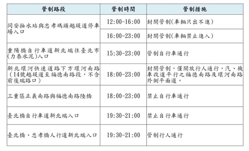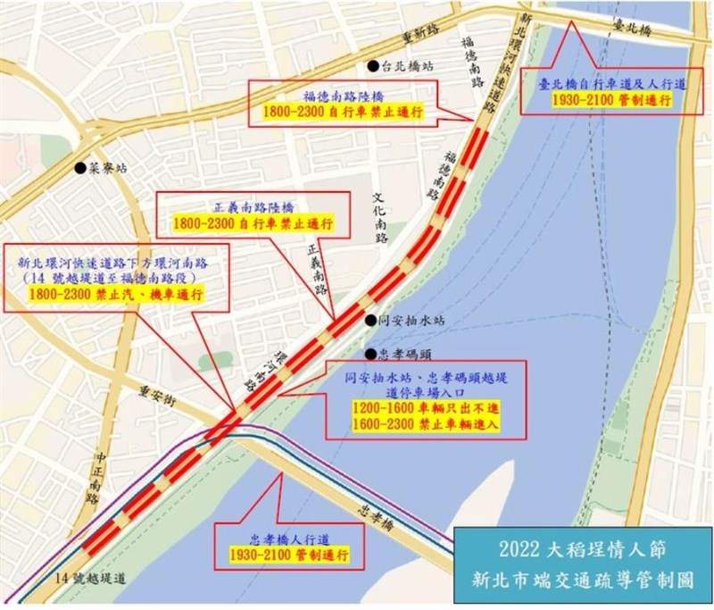 大稻埕情人節煙火7/30登場 周邊管制路段看這裡 |2022.07.27 語音朗讀 912觀看次 字級 大 中 小 台北市大稻埕情人節煙火將於7月30日登場,新北市將於當天中午12時起派員進行周邊道路管制。圖/楊正海 【本報台北訊】一年一度的台北市大稻埕情人節煙火將於7月30日登場,當天晚上8時10分至18分在台北市延平河濱公園淡水河3至5號水門間淡水河水域施放煙火長達480秒,新北市最佳觀賞地點為淡水河岸忠孝橋至台北橋堤外空間,新北市將於當天中午12時起派員進行周邊道路管制。新北市警局交通大隊表示,今年疫情趨緩,觀賞煙火人、車潮勢必增加,呼籲前往觀賞煙火民眾務必配合現場人員管制及改道,散場時請走人行樓梯離場,勿任意跨越河堤邊坡草皮,以保障自身安全。有鑑於往年煙火施放時,均有車輛違規停放於台北橋、忠孝橋、中興橋、重新橋、新北大橋、新北環河快速道路等處觀賞煙火,警方今年將持續嚴格實施禁止人、車駐留管制措施,請勿任意停留,影響交通安全。圖/新北交大提供圖/新北交大提供 前一篇文章 讓家長安心為小一作準備 新北贈1500份銜接學習袋 下一篇文章 歡慶8/1原住民日 穿族服高市優惠多多 熱門新聞 01渥太華佛光山 授海狸童軍領巾2025.11.1702【詩】遊園地.競馬場2025.11.1703警告日本 陸黃海軍演、籲暫勿遊日 2025.11.1604墨西哥熱氣球節 高空爭豔2025.11.1605芬普尼毒蛋 又爆4萬顆流入市面2025.11.1606落葉刺繡 巴西百鳥寫真集2025.11.1707克林姆富家女肖像畫 估值46億元2025.11.1708【快樂塗鴉簿】熱鬧的內灣小鎮2025.11.1709AMR機器人 是什麼?2025.11.1710中日緊張 陸4海警船巡航釣魚台2025.11.17 訂閱電子報 台北市 天氣預報 台灣一週天氣預報 相關報導 阿里山區 石虎現蹤請病假未逾10日 資方不得不利處分山谷燈光節 下周末開幕光電板泡水4個月 嘉縣府促業者清除竹崎牛稠溪改善排水 通過極端氣候考驗芬普尼毒蛋 另有1萬顆流入新北