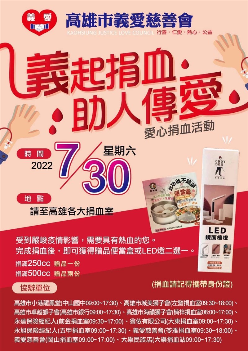 高雄市義愛慈善會關心嚴重的血荒,發起7月30日(星期六)「義起捐血 助人傳愛」活動,動員所有會員認領高雄捐血中心及所有捐血定點,並贈送實用物資,包括多功能不鏽鋼便當盒、LED燈,當天捐血地點共有10處。