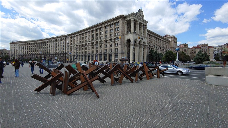 烏克蘭戰爭餘波盪漾,德國消費者信心再創新低。圖為烏克蘭首都基輔地標,獨立廣場大道擺放著戰時用於阻礙敵軍行進的路障。圖/中央社