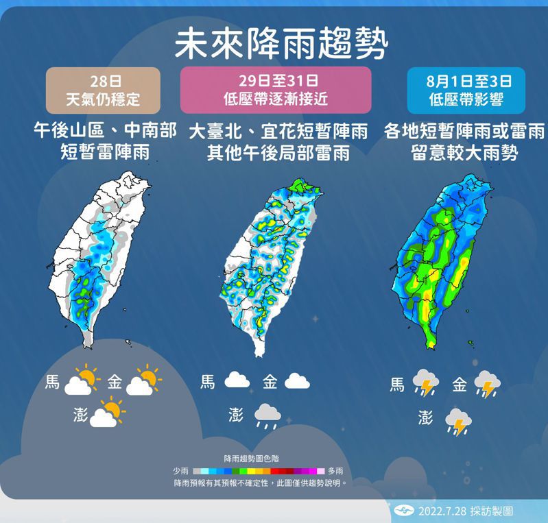 氣象局提醒,明天起到周日低壓帶接近,台灣附近水氣增多,風場為稍弱的偏北風,迎風面大台北、宜蘭、花蓮將有間歇短暫陣雨,其他各地則是晴到多雲,但須留意午後雷陣雨;清晨至上午,中南部地區也有局部短暫陣雨機率,午後雷雨易由各地山區發展,並往平地擴展,外出多留意天氣變化,攜帶雨具,也要擔心大雷雨勢造成的不便,人車用路注意安全。