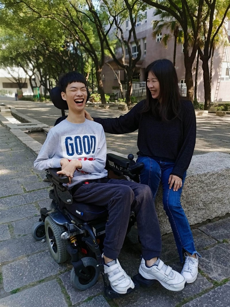 屏東大學國貿系2年級腦麻生蔡東霖(左)樂觀向學,母親王淑萍(右)一路相伴。圖/教育部提供