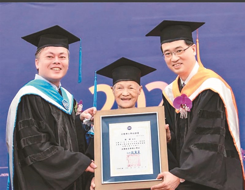 埔里慈善家陳綢(中),去年獲頒名譽教育學博士學位。圖/暨南大學提供