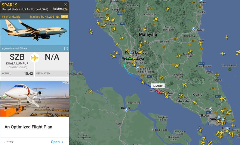 裴洛西專機下午從馬來西亞起飛來台。圖/翻攝flightradar24.com