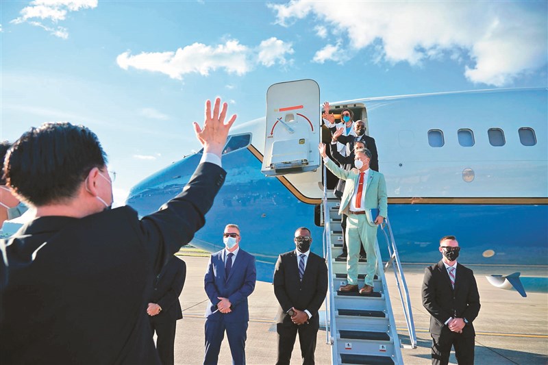 美國眾議院議長裴洛西(最上方白衣者)昨日結束不到二十四小時的訪台行程,傍晚約六時搭專機離台,裴洛西登機後在機艙門口揮手向台灣道別,外交部長吳釗燮揮手送行。圖╱中央社