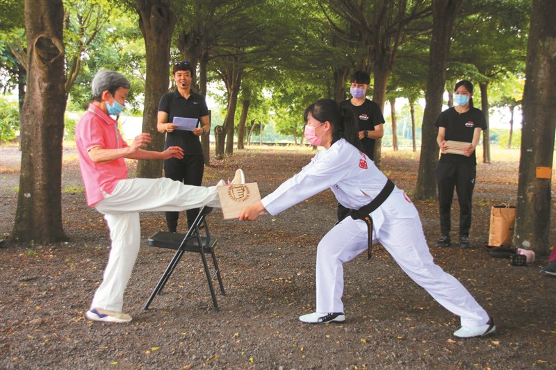 今年暑假,謝瓊儀擔任研究所學妹曾秀娟的助教,指導銀髮族跆拳道。曾秀娟用順口溜,「椅子坐一半,感情才袂散」、「身軀站乎挺,才會顧家庭」,漸進教學,讓長輩不到兩個月就能打拳、前踢、側踢,體會品勢、擊破木板的成就感。