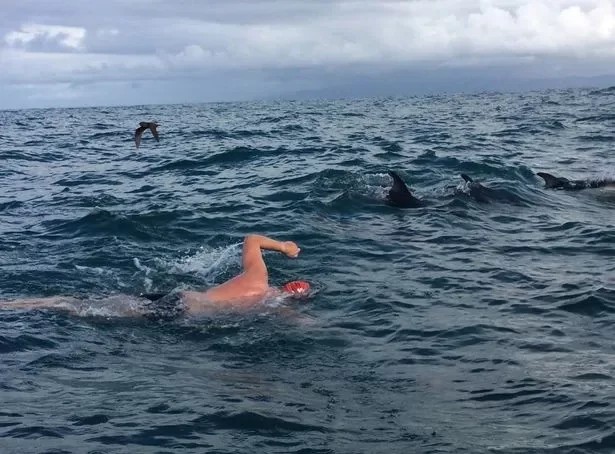 然而在開放水域游泳已是一件不容易的事,亞當沒想到自己在忙著跟海浪搏鬥之餘,還會碰上鯊魚來搗亂,事後他形容這趟下水行程「簡直就像在洗衣機游泳一樣」;但令人意外的是,一群海豚突然出現,並繞著他轉圈游動,亞當簡直不敢相信自己眼睛。