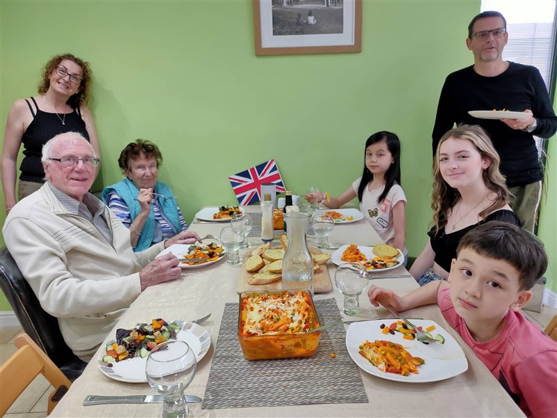及人高中的英籍老師Christopher Smith(右後)認為餐桌能傳遞文化的價值,全家人歡聚,凝聚感情。圖/新北教育局提供