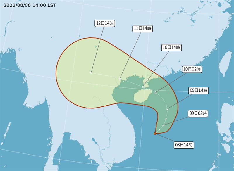 氣象局下午發布熱帶性低氣壓生成消息,熱帶低壓的中心位置在北緯14.5度,東經111.8度,以每小時13公里速度,向東北進行。中心氣壓1000百帕,近中心最大風速每秒15公尺,瞬間最大陣風每秒23公尺。