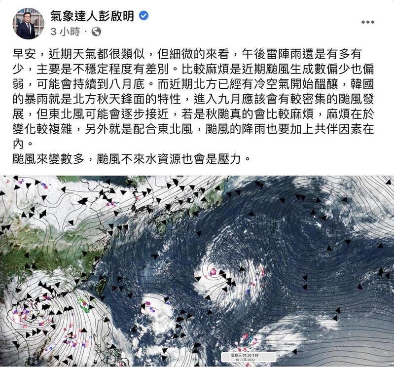 至於到底何時會轉涼,氣象達人彭啟明今天在臉書上表示,近期北方已有冷空氣開始醞釀,韓國的暴雨就是北方秋天鋒面的特性,進入九月應該會有較密集的颱風發展,但東北風可能會逐步接近,若是秋颱因為變化較複雜,真的會比較麻煩,另外配合東北風,颱風的降雨也要加上共伴因素在內。
