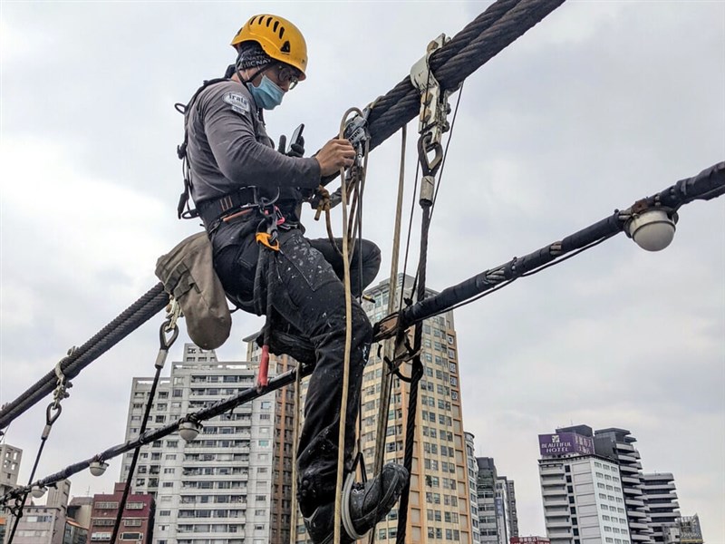 新北市觀旅局10日表示,新店碧潭吊橋歷經149天的健檢期,結果顯示橋身結構安全無虞,讓民眾及遊客都能放心遊憩。圖為工作人員檢測碧潭吊橋垂吊索穩定性。圖/新北市觀旅局提供