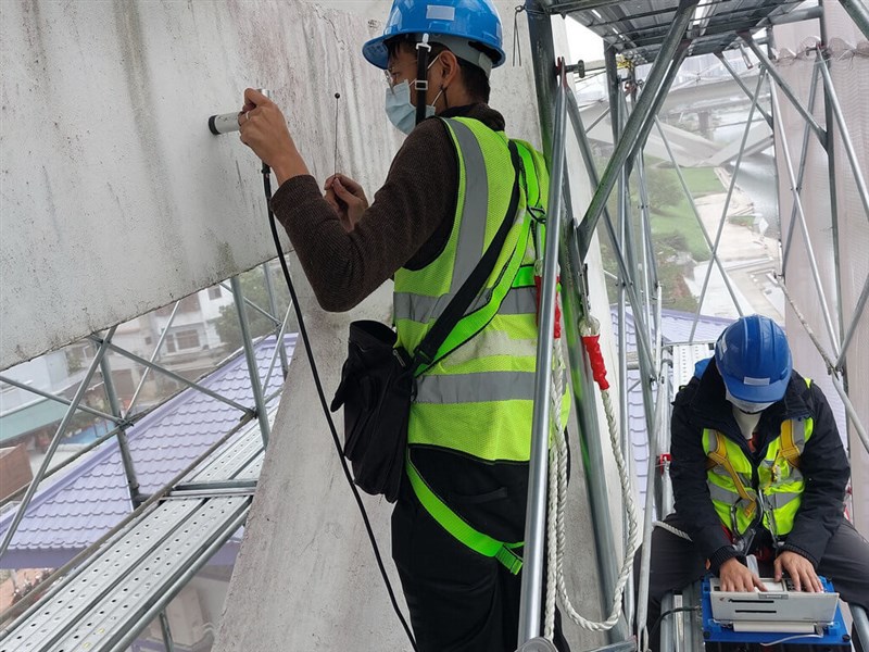 觀旅局表示,吊橋混凝土橋塔柱部分,過往的結構安全分析,集中於檢測裂縫長度與寬度;這次運用最新的「敲擊回音法」,得以檢測裂縫深度,能更準確判讀混凝土結構強度穩固性。