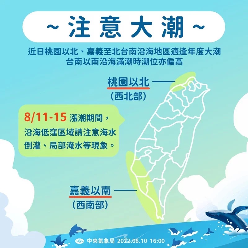 氣象局表示,各地年度大潮日期略有不同, 預計今年新竹至雲林及澎湖沿海發生的日期在9月11、12日前後。這幾個月在西南部或西部沿海發生大潮時,沿海低窪區域,也要留意海水倒灌、局部淹水等狀況。