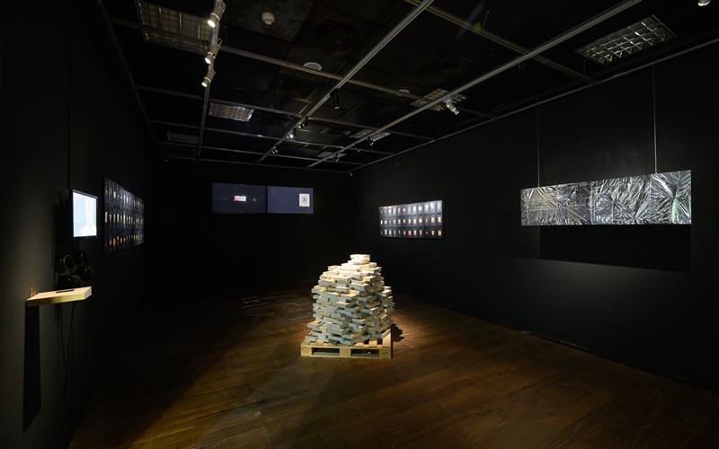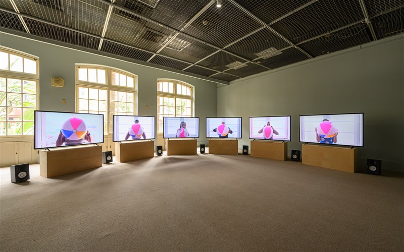 朱駿騰〈之後〉,在展場中六個螢幕分別播放不斷吹氣球的人,此起彼落的吹氣聲,觀看氣球膨脹至極限的期待,卻被一片戛然而止的黑畫面阻斷,徒留觀者內心無以名狀的失落與想像。