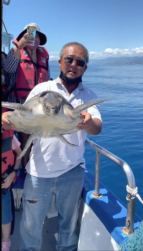 林明華說,經檢視為玳瑁海龜,並觀察海龜活動狀況良好、沒有外傷,拍照記錄後就放回海裡野放,船上的遊客都很興奮看到海龜平安,也拿起手機拍下救援過程,放生後遊客紛紛大喊「海龜再見」。