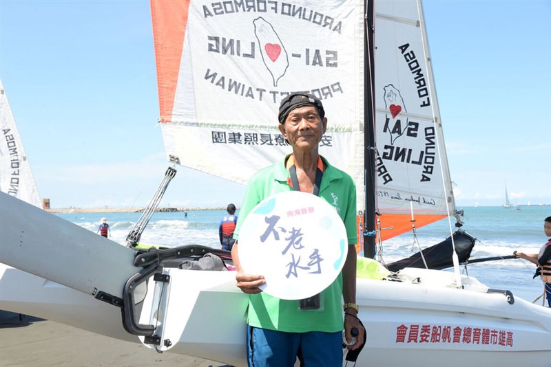 82歲「不老水手」、中華民國帆船協會副理事長詹正峰13日從高雄西子灣出發,宣告展開駕帆船環台挑戰,預計在1個月內環完全台。圖/中央社