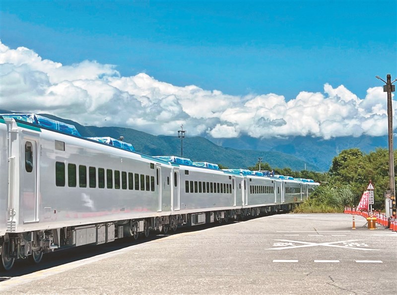 台鐵新型城際列車第17、18編組陸續抵達花蓮,車側邊條由紅色變為綠色,來自日籍設計師野末壯團隊的巧思,讓新自強號共50列的車隊能有些變化。圖/Kolas提供