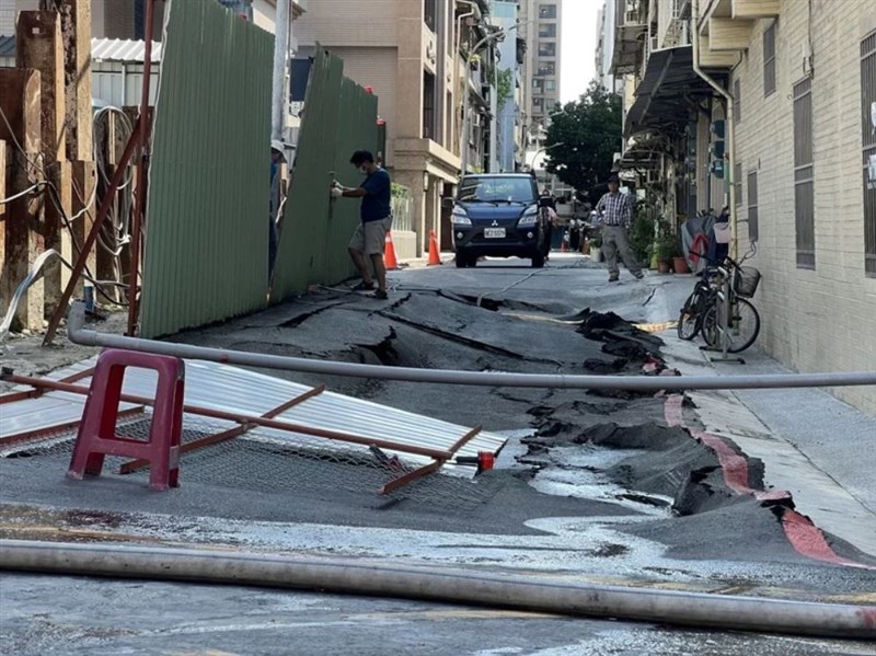 店家門口地磚隆起,現場路面高低不平,一路綿延到一旁巷弄,柏油路嚴重下陷龜裂,路面也呈現傾斜狀態,下午1時許,前金區自強一路路面突然塌陷,警方獲報趕到現場後,立即拉起封鎖線,管制人車通行,避免發生危險。
