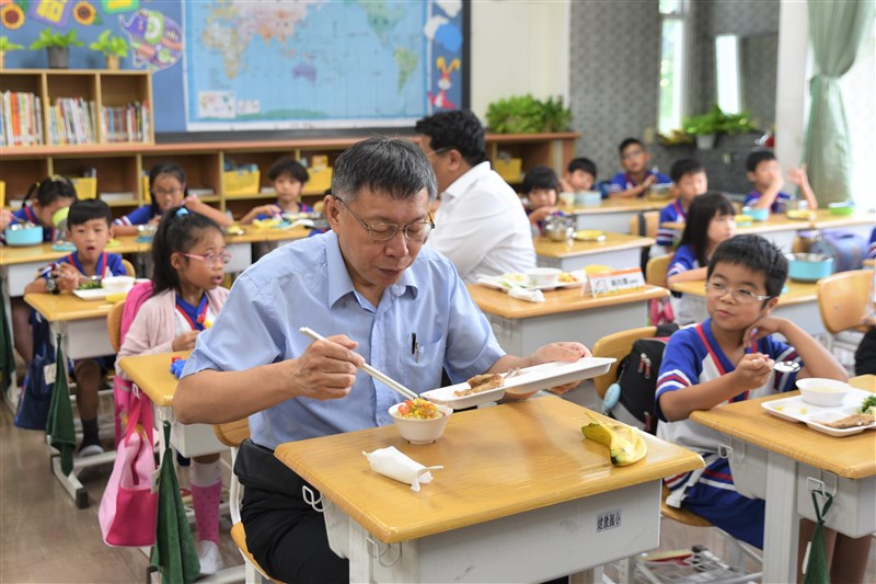 北市推每周供應有機蔬菜、有機米,90%家長支持,並認為可以增加食農教育。圖為台北市長柯文哲與學生共進有機午餐。圖/北市教育局提供