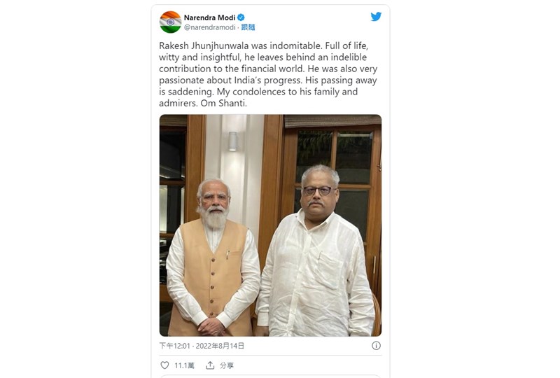 印度總理莫迪(Narendra Modi)今天推文盼金君瓦拉(Rakesh Jhunjhunwala)安息,並貼出兩人之前的合照,讚揚他為金融界作出卓越貢獻。