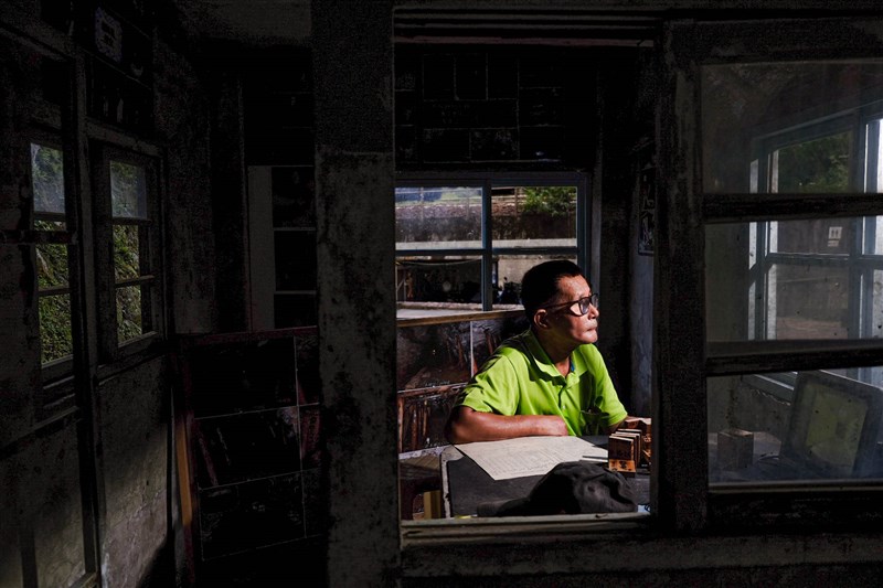 《末代礦工攝影計畫》環境肖像作品。猴硐礦工文史館志工許進益,坐在當年礦坑旁的檢身室,回想當年望著礦工一個個身影消逝於坑口,日日冒險入坑討生活的畫面。圖/北科大提供