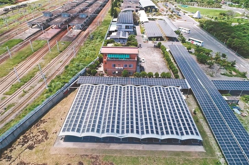 台鐵響應節能減碳,在台東火車站區內十二棟建築物規畫設置屋頂型太陽光電;另露天的人行道、停車場、計程車排班區,規畫設置整合型太陽光電棚架。估計每年減少的二氧化碳排放量,相當於設二座大安森林公園的吸碳量,台鐵每年還可收取售電回饋金約八十七萬元。圖╱中央社