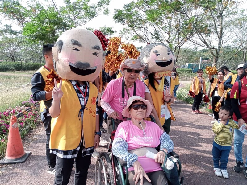 弘道鼓勵長輩健走、延緩生理功能退化及失能,圖為往年老老照顧、用輪椅協助完成3公里健走的壯舉。圖/弘道老人福利基金會提供