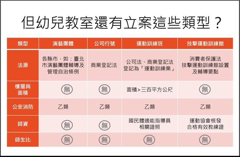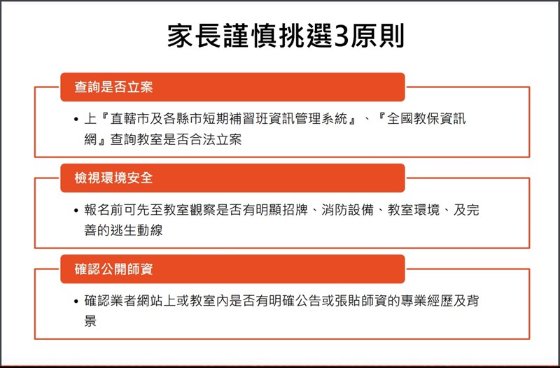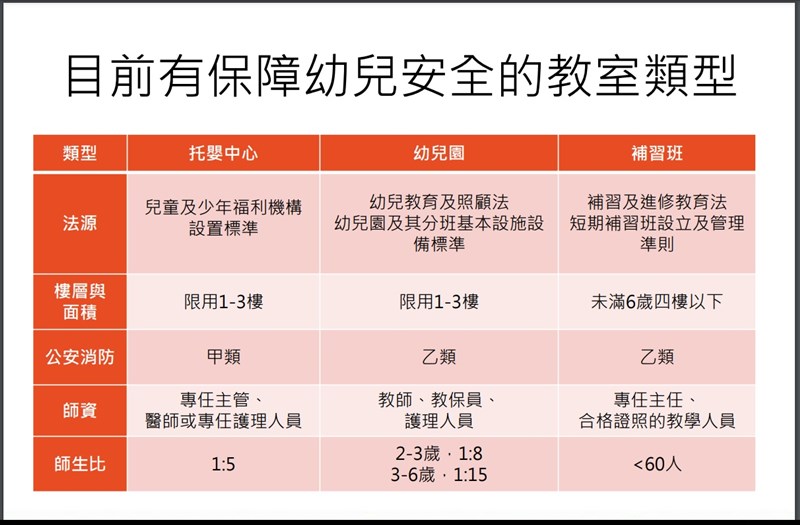 調查25家幼兒教室「全不合法」 民團籲政府控管 李祖翔 |2022.08.18 語音朗讀 3876觀看次 字級 大 中 小 靖娟兒童安全文教基金會執行長林月琴表示,走訪調查25家幼兒教室竟全不合法,其中8成消防設備不完整。圖/靖娟兒童安全文教基金會提供 【記者李祖翔台北報導】「民間幼兒上的課,安全嗎?」靖娟兒童安全文教基金會今天上午召開記者會,指出幼兒課程商機約2億,但突擊檢查六都共25家幼兒教室竟「沒有一間合法立案」,希望政府推動合法標章,並讓民眾學習辨識、也讓家長知道若有爭議可以向誰申訴。「你的小朋友上什麼課?」基金會街訪,民眾表示:「上黏土、畫畫等美術和直排輪課。」又問「課程資訊來自什麼管道?」家長說:「學校張貼的訊息、其他家長告知及手機滑到的。」但在詢問「你知道幼兒教室需要合法立案嗎?」普遍一頭霧水,一位長輩則說:「只注意逃生出口。」合法、有保障的幼兒教室。圖/靖娟兒童安全文教基金會提供靖娟兒童安全文教基金會執行長林月琴說,坊間或網路隨處可見掛著共學空間、工作室、舞蹈團的招生訊息,但這些幼兒教室是否合法立案?使用的空間安全嗎?調查結果竟然是否定的。基金會實際走訪調查,近8成的幼兒教室沒有完整的消防設備,甚至有教室設立於14樓的高樓層或地下室,師生比一對多,且幼兒為避難弱者,若發生事故恐難應變! 基金會認為安全性不足或有爭議的幼兒教室現況。圖/靖娟兒童安全文教基金會提供林月琴說,幼兒課程常規避補教法及建築法規,難道去年新北市虎豹潭事故帶走6條人命,追究真相的開課單位就只是「一家公司」,也未幫參與者保險,不夠凸顯這類「教室」、「共學空間」問題叢生嗎?坊間陸續出現以幼兒為對象、五花八門的課程,許多幼兒教室登記為「演藝團體」、「公司行號」、「運動訓練班」,沒有針對設立樓層、公安消防、師資做規範,是「偽補習班」且無法罰款或勒令停業。依《短期補習班設立及管理準則》規定,招生未滿6歲幼兒之補習班,須設立於4樓以下,因為幼兒屬避難弱者,無法自行逃生,「卻發現有業者將教室設立於14樓的高樓層」。另依《建築法》規定,建築物應依核定使用類組使用,如須設立補習班,就得將建築用途變更為「補習班」,但多間幼兒教室卻登記為「住家」、「防空避難室」,不僅空間狹小,有的僅一條逃生通道,都是讓幼兒處於不安全的環境中。因為幼兒教室營業項目五花八門,導致主管機關分屬不同單位,基金會認為,若出現糾紛恐難申訴與獲得保障。圖/靖娟兒童安全文教基金會提供師資篩選也是令基金會替家長感到擔憂的。林月琴表示,法規要求補習班或幼兒園須明確登載教職員工名冊,提供學經歷及身分證明,檢附3個月內核發之刑事紀錄證明等,但靖娟調查的多數業者,僅於網路Facebook、Line社群招生,查不到任何教師的專業資格,實際到場也無法判斷是否為合法或無犯罪紀錄之教師。因此基金會呼籲,政府應重視6歲以下幼兒的學習安全,盡速清查,並輔導這些教室合法立案,也提醒家長挑選課程時多觀察環境、了解教室是否合法。台灣家長教育聯盟祕書長李昭瑢補充,建議政府管理、下發給立案的教室或場域使用標章,並張貼或出示於明顯處,也請各縣市增加宣導資訊,而為讓家長知道可以向誰查詢、申訴、詢問,教育局處應公告對應窗口,避免孩子受害時,家長求助無門。基金會提供挑選幼兒教室的3個原則,呼籲家長謹慎。圖/靖娟兒童安全文教基金會提供 前一篇文章 大專辦理「員工子女非營利幼兒園」111學年增加9園 下一篇文章 新北水域安全防護網 自救實地情境教育 熱門新聞 01渥太華佛光山 授海狸童軍領巾2025.11.1702警告日本 陸黃海軍演、籲暫勿遊日 2025.11.1603【詩】遊園地.競馬場2025.11.1704墨西哥熱氣球節 高空爭豔2025.11.1605克林姆富家女肖像畫 估值46億元2025.11.1706芬普尼毒蛋 又爆4萬顆流入市面2025.11.1607【快樂塗鴉簿】熱鬧的內灣小鎮2025.11.1708AMR機器人 是什麼?2025.11.1709落葉刺繡 巴西百鳥寫真集2025.11.1710中日緊張 陸4海警船巡航釣魚台2025.11.17 訂閱電子報 台北市 天氣預報 台灣一週天氣預報 相關報導 三重二二八公園 紫色花瀑優雅垂落北市府新壽解約 輝達落腳北士科定案特富野古道美景 接連獲獎阿里山區 石虎現蹤請病假未逾10日 資方不得不利處分山谷燈光節 下周末開幕 作者其他文章家扶無窮世代計畫 5千萬元缺口待補 憂YTR倡偏方 陽光急闢謠:燒燙傷快「沖冷水」2022金扶獎頒獎 賴清德勉勵5位自立「家扶兒」淨灘、立槳到吃素 培力園帶孩子體驗生活新風貌讓愛流動 祖父母為己立傳邀祖父母為自己立傳 壯世代讓家庭的「愛」流動