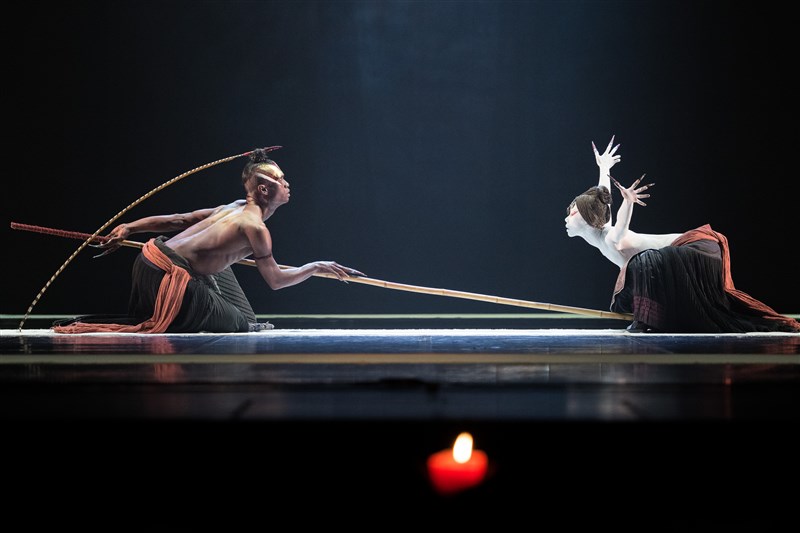 無垢舞蹈劇場《觀》主要角色鷹族Samo(李亙卬飾)與白鳥(吳明璟飾)呈現絕美雙人舞。圖/兩廳院提供、張震洲攝影