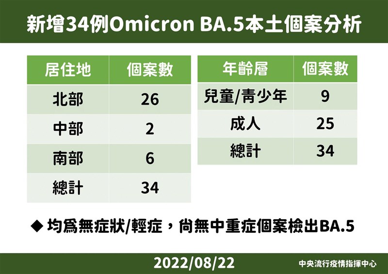 新增34例Omicron亞型變異株BA.5本土個案,為22名男性、12名女性,年齡介於未滿5歲至90多歲,分布為北部26例、中部2例、南部6例,確診日介於8月3日至8月14日。其中兩位為一對北部50多歲夫妻,因前往機場接自新加坡返國的家人,因同車而確診。
