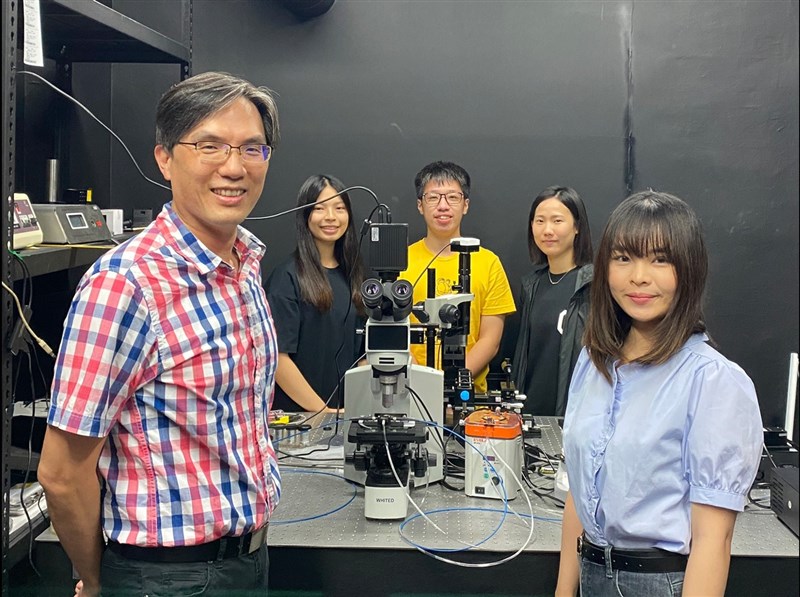 陽明交大生物醫學工程學系教授劉承揚(前排左)及碩士生鄂暄蓓(前排右),利用人面蜘蛛的蜘蛛絲,開發出「光纖糖度感測器」。圖/陽明交大提供
