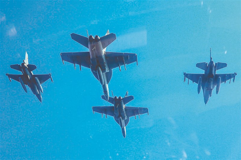 美國總統拜登23日下令空襲敘利亞代爾祖爾省境內,伊朗伊斯蘭革命衛隊附隨組織使用的設施。圖為美國海軍的F/A-18E超級大黃蜂戰機,7月25日與比利時空軍的F-16戰機在地中海演習時編隊飛行。