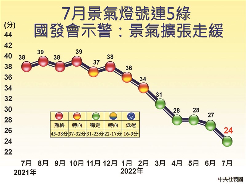 7月景氣燈號續呈綠燈,但分數減3分到24分,若跌到22分就會掉到代表景氣轉向的黃藍燈。9項構成項目中,只有工業生產指數分數增加1分,由黃藍燈轉呈綠燈,但股價指數、非農業部門就業人數、製造業銷售量指數各減1分,4項指標都從黃藍燈掉到藍燈,機械及電機設備進口值也由紅燈轉呈黃紅燈;其餘4項燈號不變。