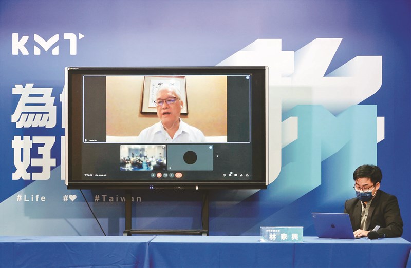 國民黨昨晚舉行赴陸訪團返台報告記者會,副主席夏立言(螢幕上)因需檢疫隔離,透過視訊說明。右為國民黨文傳會副主委林家興。圖/中央社