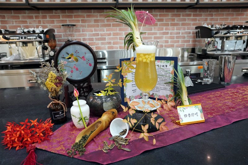 郭宜靜公開得獎飲品「四季珍嚐」的調製配方,新鮮鳳梨汁、桂花糖漿、百香果糖漿、瓜子水和冰塊,倒入名間鄉的四季春茶,以搖盪法讓冰塊撞擊產生綿密泡沫,突顯出茶香與鳳梨香,瓜子水應該是致勝祕器,先炒香葵瓜子再倒開水,水中同時有瓜子的清香與鹹甜味,可融合鳳梨酸甜與桂花甜香,最後放入切丁的帝王鳳梨增加飲用時的咀嚼口感。