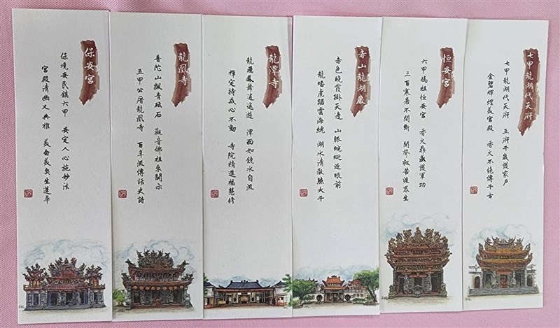 【記者羅智華台南報導】為結合藝文傳承台灣老廟信仰,台南市六甲區公所攜手畫家之力,以龍凰寺、保安宮等六甲地區多間古廟為底圖、搭配詩文,設計出獨樹一格的「寺廟書籤」,巧妙透過文創與藝術來彰顯廟宇文化。