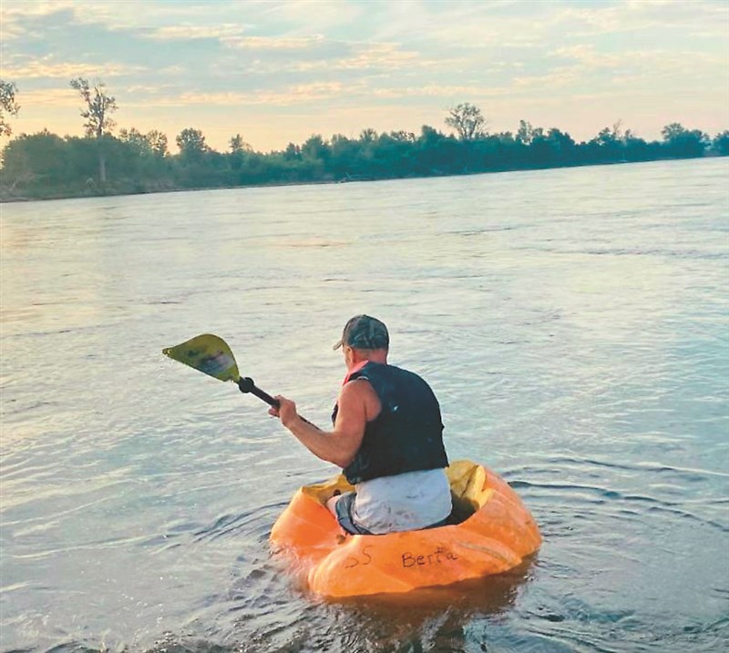 漢森乘坐巨型南瓜船,在密蘇里河划行六十一公里,有望打破金氏世界紀錄。圖/取自網路